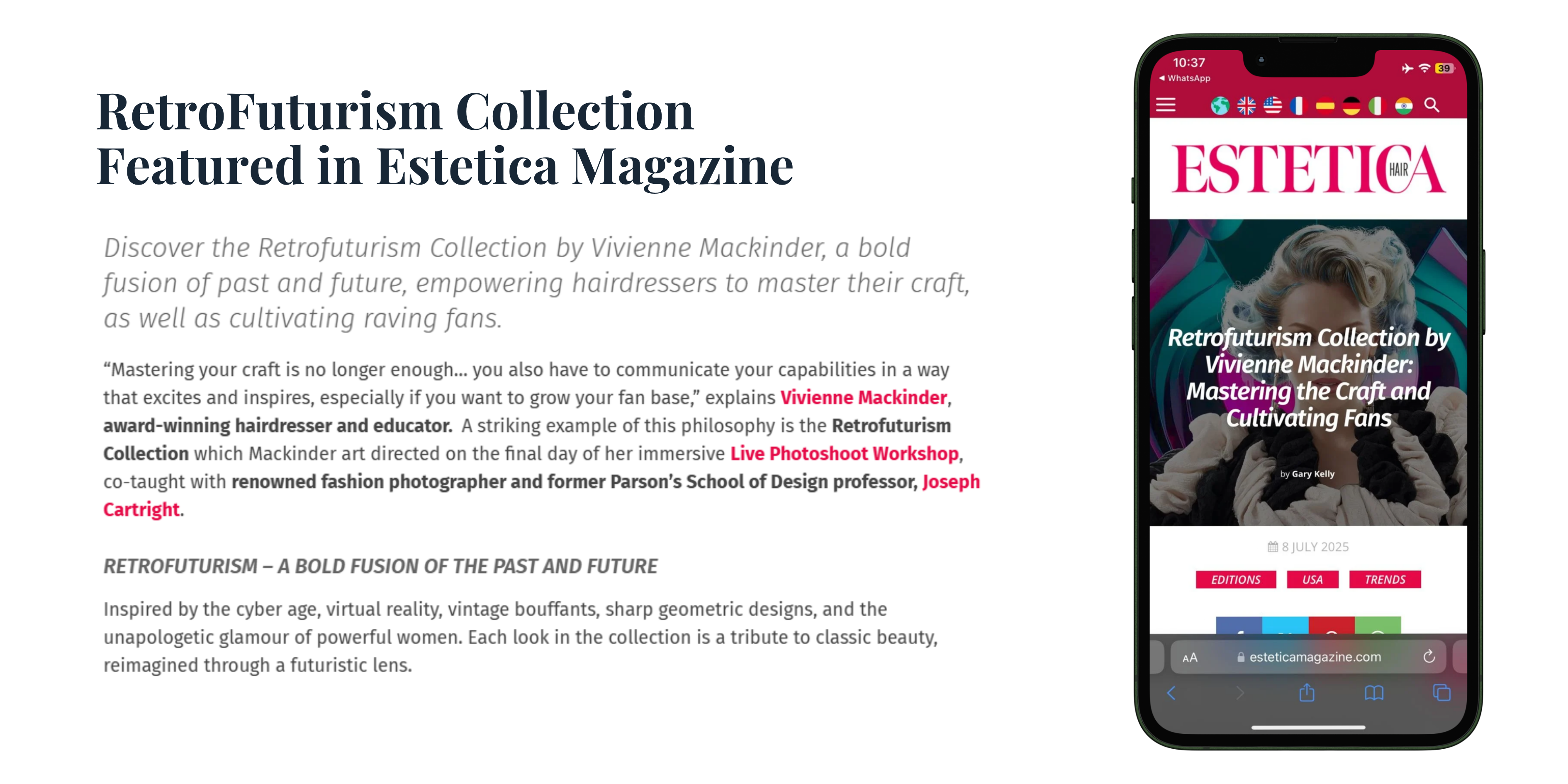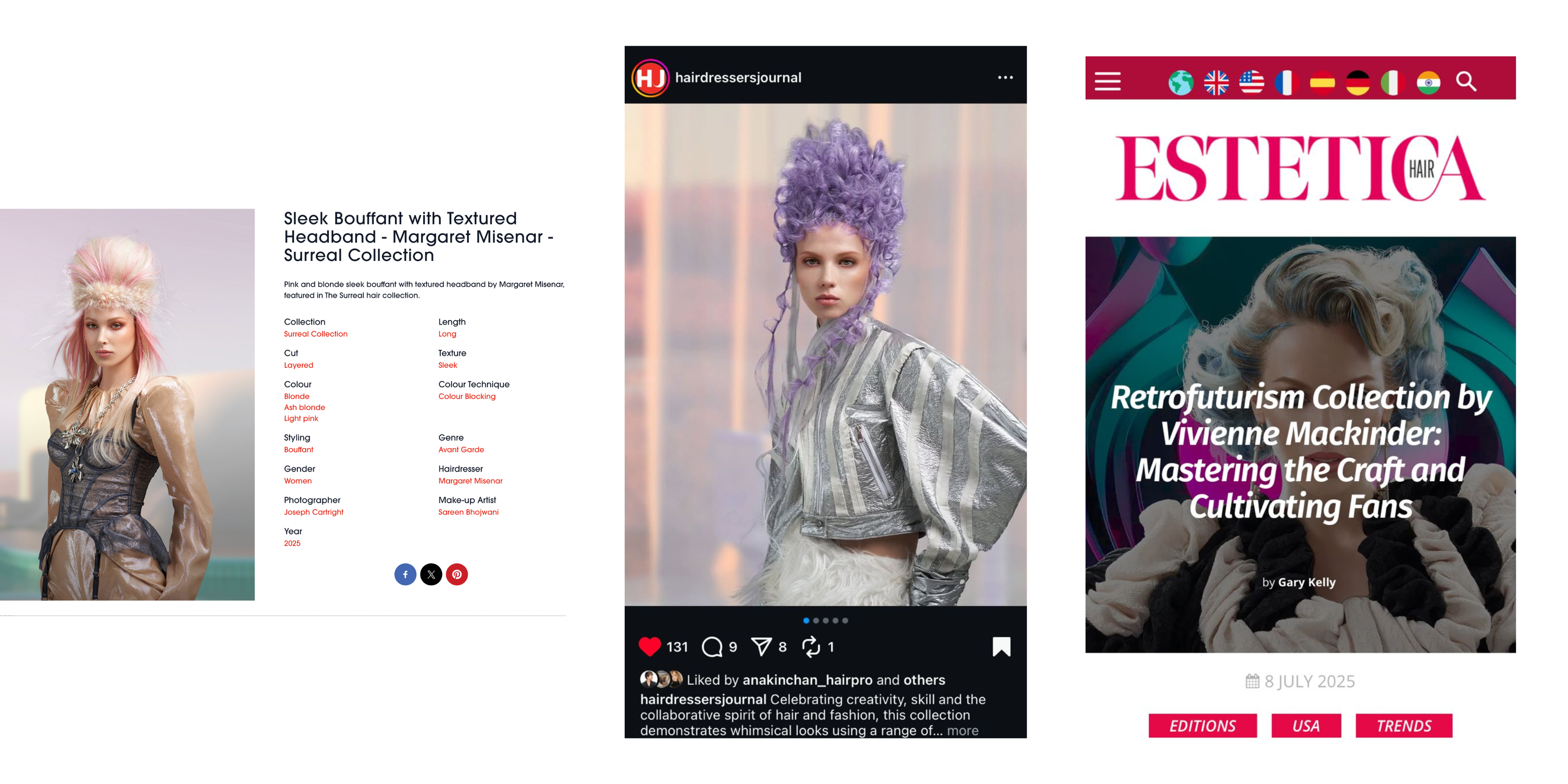 The Surreal Collection was chosen as "Collection of the Week" by Hairdressers Journal Magazine, celebrating the creative work of students from our Photoshoot Workshop. And the Retrofuturism Collection made its way to the pages of Estetica Magazine, where innovation and classic design came together.
